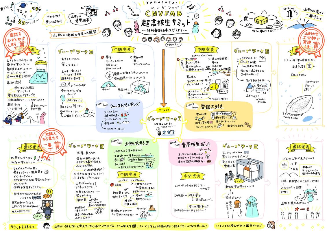 山形県の高校生13名が参加し、活発な議論がされました。その取り組みをグラフィックレコーディングで、イラストレーターのヤマサキミノリさんに、可視化していただきました。それが下記にグラフィックになります!