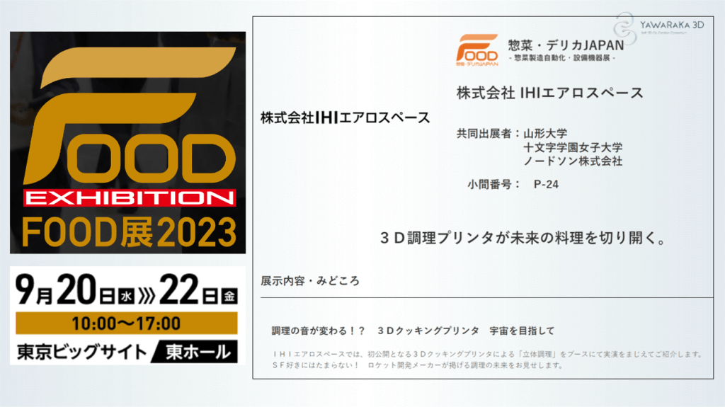 IHIエアロスペースでは、初公開となる3Dクッキングプリンタによる「立体調理」をブースにて実演をまじえてご紹介します。