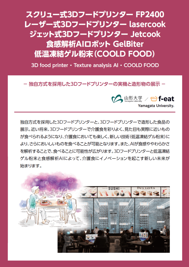 近い将来、3Dフードプリンターで介護食を彩りよく、見た目も実際に近いものが食べられるようになり、介護食においても楽しく、新しい技術(低温凍結ゲル粉末)により、さらにおいしいものを食べることが可能となります。また、AIが食感ややわらかさを解析することで、食べることに可能性が広がります。3Dフードプリンターと低温凍結ゲル粉末と食感解析AIによって、介護食にイノベーションを起こす新しい未来が始まります。