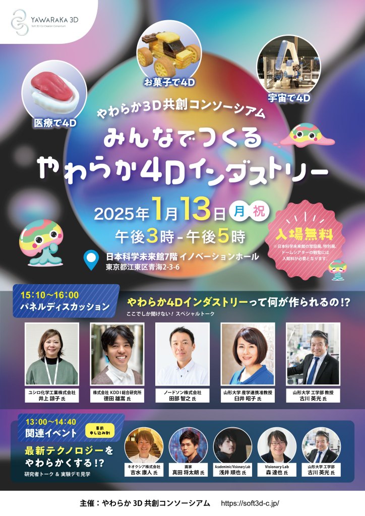 日本科学未来館で無料公開イベント開催「みんなでつくる やわらか4Dインダストリー」 (2025.1.13) January 11, 2025 Written by hidemitsufurukawa 1月13日(月・祝)15:00-17:00 日本科学未来館で無料公開イベントを開催します! 「みんなでつくる やわらか4Dインダストリー」 ご来場お待ちしております! (主催: やわらか3D共創コンソーシアム) Share this: Click to share on X (Opens in new window) X Click to share on Facebook (Opens in new window) Facebook Click to print (Opens in new window) Print Click to email a link to a friend (Opens in new window) Email Click to share on LinkedIn (Opens in new window) LinkedIn Click to share on WhatsApp (Opens in new window) WhatsApp Like Loading... Related