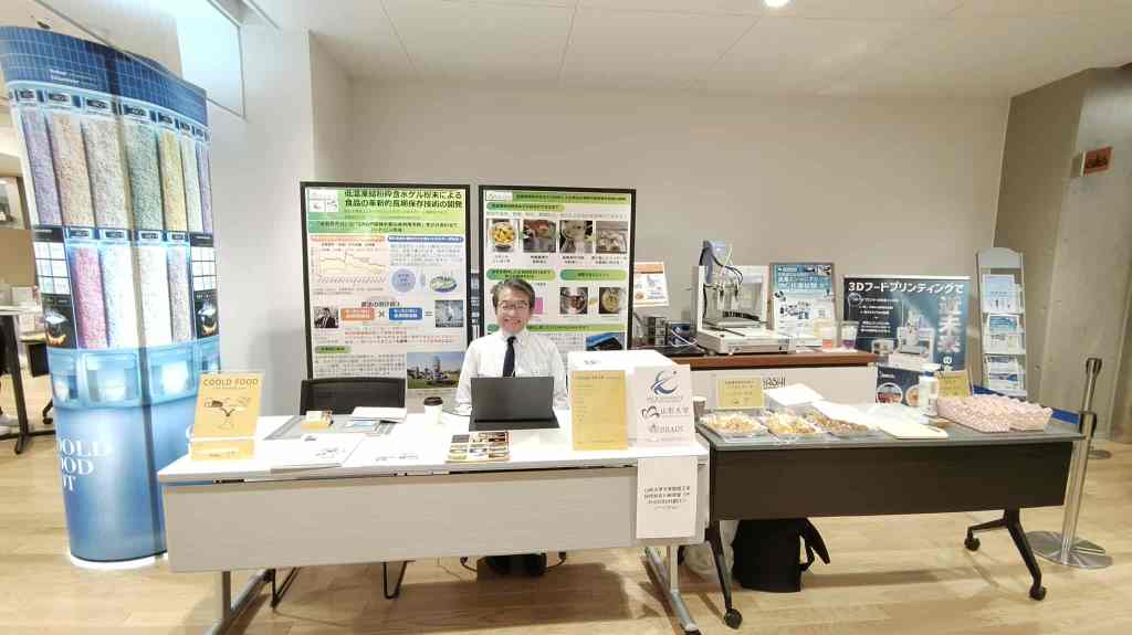 低温凍結粉砕含水ゲル米粉を活用して作った、シフォンケーキとラスクの展示になります。
